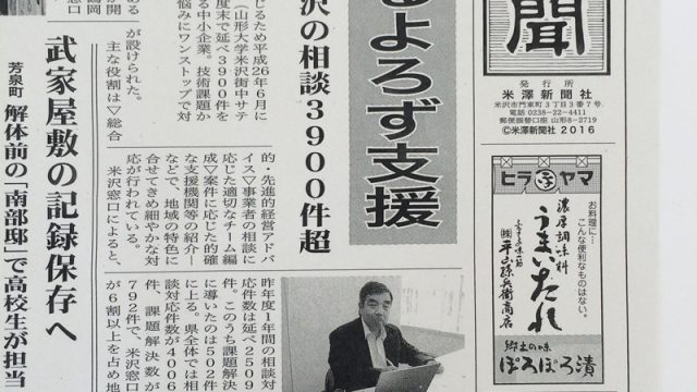 成果を挙げるよろず支援として米澤新聞の1面に掲載されました 山形県よろず拠点米沢窓口が、2016年7月28日発行 米澤新聞の1面で掲載されました。開設2年で、米沢での相談件数が3900件超になりました。解決件数も500件を超えております。今後とも、地域の経営課題解決に尽力させていただきます。... 2016.08.01