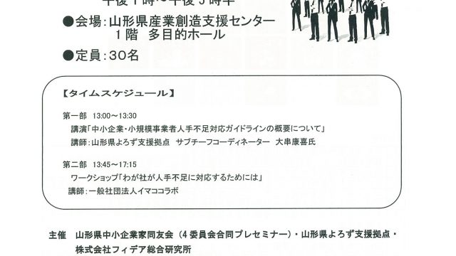 8/27「人手不足対応ガイドライン活用に係るセミナー」が行われました。 「中小企業・小規模事業者人手不足対応ガイドライン」活用セミナー 日 時:平成30年8月27日(月)13:00~17:30 会 場:山形県産業創造支援センター 1階 多目的ホール(山形市松栄1-3-8) 参加者:約50名(中小企業経... 2018.09.21