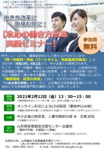 山形県働き方改革推進支援センター主催、山形県よろず支援拠点及び山形商工会議所共催で、「攻めの働き方改革実践セミナー」が開催されます。