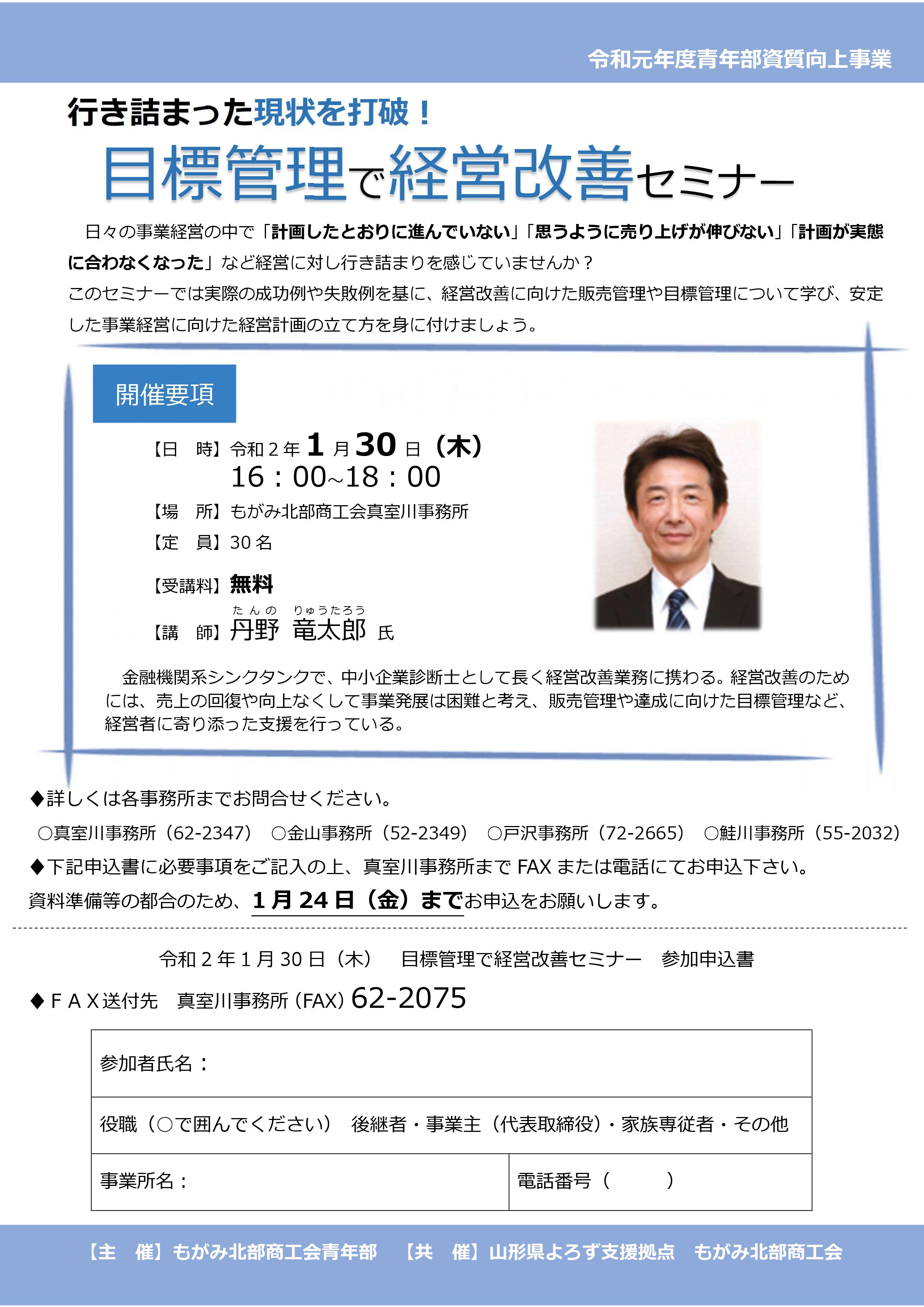 令和2年1月30日(木)16:00~18:00、“目標管理で経営改善セミナー”をもがみ北部商工会真室川事務所にて開催します。