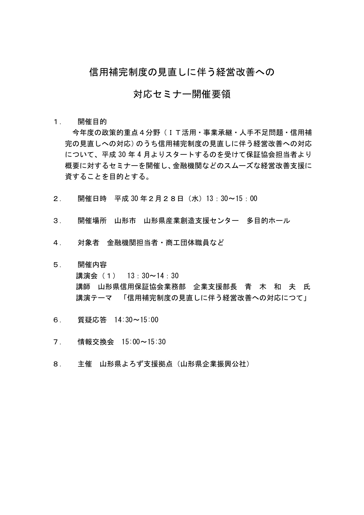 2/28 「信用補完制度の見直しに伴う経営改善への対応セミナー」開催のお知らせ 2018.02.14 平成30年2月28日(水)に「信用補完制度の見直しに伴う経営改善への対応セミナー」が開催されます。詳しくは資料をご覧ください。 <PDFダウンロードはこちら>
