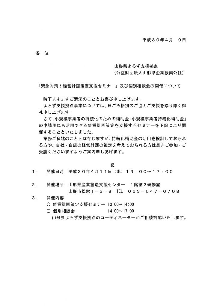 4月11日、13:00~17:00にて「緊急対策!経営計画策定セミナー」(小規模事業者持続化補助金対策用)を開催します。補助金を上手に活用するための対策を一緒に行うミニセミナーです。また、個別での対応も予定しております。会場は産業創造支援センター1F第2会議室になります。まずはお気軽にお問い合わせください。