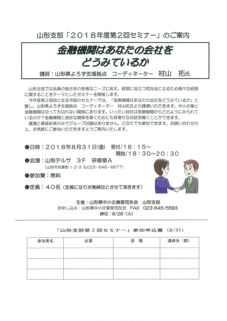 8/31に山形県中小企業家同友会山形支部主催の第2回目となるセミナー題して「金融機関はあなたの会社をどうみているか」が山形テルサ 3F 研修室A(山形市双葉町1-2-3)にて開催されます。詳細は こちらPDFをご覧ください。