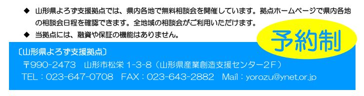 お近くの商工会議所・商工会・金融機関・市町村または、山形県よろず支援拠点にご相談ください。